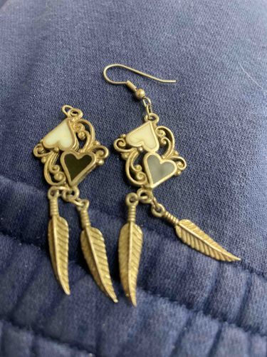 This item is a pair of dangle earrings featuring a mixture of romantic and bohemian motifs. The main body of each earring consists of a brass-toned or gold-toned base metal frame with intricate openwork filigree and scroll patterns. Within this frame are two heart-shaped inlays: one in a cream or off-white color and the other in a dark green or black shade, possibly made of resin or enamel. Suspended from the bottom of each filigree square are two stamped metal feather charms with visible vein detailing. One earring retains its fishhook-style ear wire, while the other is missing the ear wire but retains the jump ring attachment. The metal shows a dark patina and signs of oxidation consistent with age, particularly in the recessed areas of the filigree and along the edges of the feathers. The craftsmanship suggests a mass-produced fashion jewelry origin, likely from the late 20th century, imitating a southwestern or bohemian aesthetic. No visible maker's marks are discernible in the image. The overall condition is fair given the missing component and surface wear.