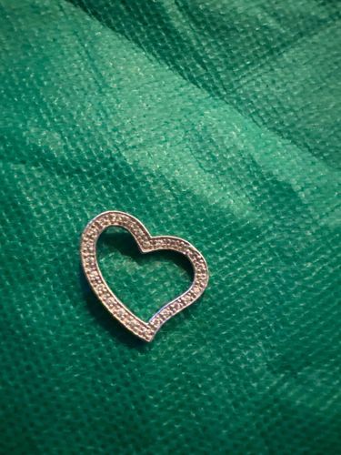 This jewelry item is a small, open heart-shaped pendant, crafted in a contemporary 'slanted' or 'tilting' aesthetic. The piece is constructed from a white metal, likely 10k or 14k white gold or sterling silver, given the bright, reflective finish. The front surface is channel or grain-set with a continuous row of small round-cut white stones, which appear to be diamonds or high-quality cubic zirconia, creating a pave effect that enhances the brilliance of the piece. The pendant lacks a traditional visible bail at the top; instead, it utilizes a hidden slider-style design through the back or the side of the heart, allowing it to hang directly on a thin chain. In terms of condition, the metal shows minor surface scratches consistent with light wear, but the overall structural integrity remains sound with no missing stones readily apparent. The craftsmanship is refined, with smooth polishing on the interior and exterior edges. This style gained significant popularity in the late 20th and early 21st centuries, often associated with romantic motifs and minimalist everyday elegance. The item is currently displayed against a textured green background, which highlights the crisp white luminosity of the metal and the spark of the set stones.