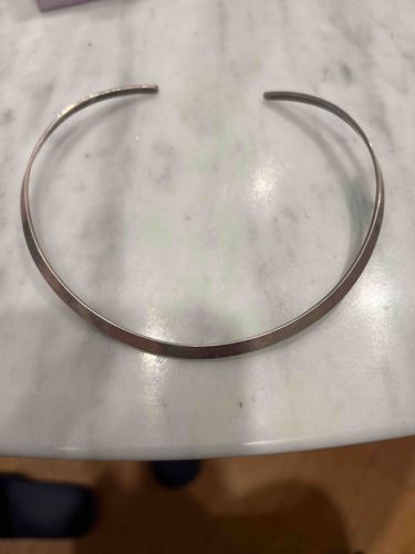 This item is a minimalist sterling silver torque-style necklace, specifically designed as an open collar or choker. It features a circular, rigid construction crafted from solid sterling silver tubing that tapers slightly towards the terminals. The color is a characteristic metallic grey-white, typical of high-purity silver. The surface displays a brushed or satin finish rather than a high-polish shine, which emphasizes its mid-century modern aesthetic. Structurally, the necklace is an open hoop designed to be worn closely around the neck, relying on the inherent tension and flexibility of the metal for secure placement. Regarding condition, the piece shows visible surface patina and micro-abrasions consistent with frequent wear and age. There are darker areas of oxidation, particularly towards the terminals and the inner curve, which could be restored with professional polishing or left to preserve its vintage character. No major kinks, dents, or deep gouges are observed, suggesting good structural integrity. While hallmarks are not visible in the primary view, such pieces usually bear a '925' or 'Sterling' stamp near the end caps. The style is indicative of the late 20th century, likely dating from the 1970s to the 1990s, inspired by Scandinavian minimalist design. The craftsmanship appears high, with smooth transitions and even tapering throughout the circumference.