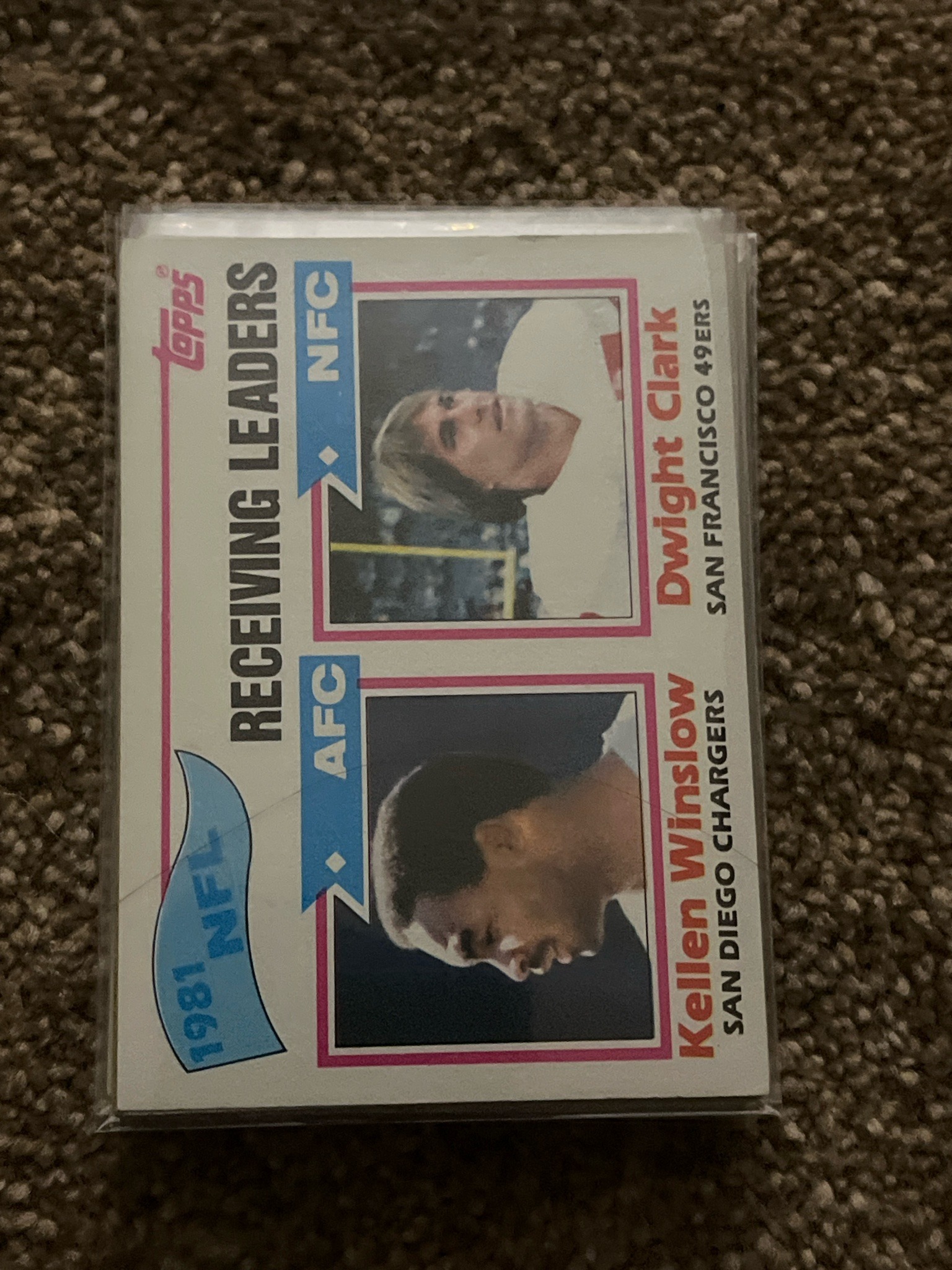 This is a 1982 Topps NFL football card featuring the 1981 Receiving Leaders for the NFC and AFC. The card measures standard trading card size (2.5 by 3.5 inches) and is printed on typical 1980s cardboard stock with a semi-gloss finish. The front design is oriented vertically, featuring two headshot photographs: San Francisco 49ers wide receiver Dwight Clark on the top and San Diego Chargers tight end Kellen Winslow on the bottom. The photos are framed by pink borders, with blue 'AFC' and 'NFC' banners and a bottom-left '1981 NFL' blue wave graphic. The printing color palette includes white, blue, pink, and black. Regarding condition, the card appears to be housed in a clear protective sleeve; through the plastic, the centering looks fairly decent but displays a slight left-to-right bias. The corners show mild softening consistent with a vintage ungraded card. There is a visible horizontal crease mark across the lower center, crossing the bottom photo of Winslow, which significantly impacts the technical grade. No major ink loss or liquid staining is visible on the surface. This card represents a significant era in NFL history, capturing Dwight Clark during the 'The Catch' season and Hall of Famer Kellen Winslow during his peak dominance.