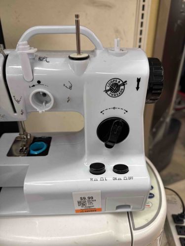This is a compact, entry-level desktop sewing machine branded by 'Loops & Threads.' The item is primarily constructed of white injection-molded plastic with black plastic controls and a metal spool pin. Measuring approximately 8 to 10 inches in height, it features a built-in carrying handle and a small, integrated work surface. On the front panel, there are several printed black icons illustrating threading instructions, the 'Loops & Threads' logo, and speed/power indicator symbols. Notable features include a top-loading spool pin, a bobbin winder, a black tension dial, and two push buttons for speed control (High/Low) and the On/Off function. A black handwheel is situated on the right side. The machine appears to be a modern, mass-produced textile craft tool likely intended for beginners or small repairs rather than heavy-duty tailoring. Condition-wise, it shows minor surface scuffs and dust common with pre-owned items found at a thrift shop, as evidenced by a $9.99 price sticker on the base. No significant cracks or missing major external components are visible, though the needle and presser foot assembly are only partially visible on the left. This style of machine is typical of contemporary 21st-century craft manufacturing commonly sold at retailers like Michaels.