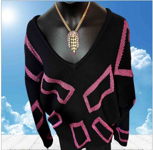 This garment is a long-sleeved, black wool-blend knit sweater featuring a prominent V-neckline. The primary aesthetic feature consists of large, abstract geometric rectangular and chevron-like shapes in a contrasting metallic magenta or fuchsia pink. These decorative elements appear to be integrated into the knit using an intarsia or jacquard technique, creating a textured, shimmering effect against the matte black base. The sweater lacks visible buttons or closures, indicating a pullover style. The construction suggests a medium-weight knit with ribbed detailing likely present at the cuffs and hem, though somewhat obscured by the draping. The silhouette is slightly oversized, characteristic of late 1980s or early 1990s fashion. No visible maker’s marks, labels, or tags are shown, making specific designer identification difficult without internal inspection. The condition seems excellent with no visible pilling, snags, or fading in the metallic threads. The craftsmanship is of high quality, evidenced by the clean edges of the geometric patterns and the consistent tension of the knit. The item is displayed on a mannequin with a decorative statement necklace, emphasizing its potential as a high-fashion evening or avant-garde piece.