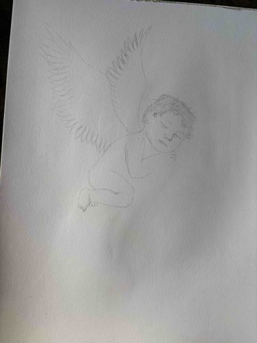 This item is an original, hand-drawn pencil sketch on white art paper, depicting a sleeping cherub or putto. The figure is rendered in a classical style, showing a young winged child in a fetal-like sleeping position with eyes closed and a peaceful expression. The sketch is executed primarily with graphite pencil, using a combination of light contour lines for the body and more detailed, repetitive strokes to define the feathers of the prominent wing and the curly hair. The paper has a slight texture or grain, consistent with standard mid-weight drawing paper. There are no visible artist signatures, dates, or manufacturer stamps on the front of the work. The condition appears fair to good for a preliminary sketch; there are slight smudges typical of graphite work and minor buckling of the paper at the lower-left corner. The style is reminiscent of Renaissance or Baroque motifs, though the execution suggests a contemporary student or hobbyist study rather than an antique master drawing. The composition is centered on the upper half of the page, leaving significant negative space below, which may indicate it is a study for a larger piece.