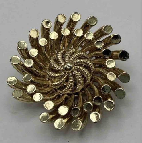 This is a vintage Corocraft brooch featuring a distinctive Mid-Century Modern 'sunburst' or 'atomic' design. The piece is constructed from a gold-toned base metal, likely a gold-plated costume alloy typical of the 1950s or 1960s. The design is highly dimensional, consisting of a central cluster of coiled, textured wires arranged in a spiral pattern, radiating outward into numerous smooth, curved cylindrical rods. Each rod terminates in a flattened, circular end, creating a dynamic sense of movement and depth. The finish is a bright yellow gold-tone that exhibits varying textures, from the high-polish tips to the ribbed center. In terms of condition, the brooch shows signs of age-appropriate wear. There is visible surface scratching on the flat end-caps of the rods and some minor pitting or oxidation consistent with vintage costume jewelry. The gold plating remains largely intact, though some thinning may be present in recessed areas. While the maker's mark 'Corocraft' is not visible in the front-facing view, it is typically located on the reverse side on a rectangular cartouche or directly stamped. The craftsmanship is indicative of Coro’s higher-end line, featuring robust construction and a complex, multi-layered assembly. This style represents the futuristic aesthetic of the post-war era, popularized by high-end costume jewelry manufacturers.