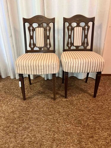 This is a pair of vintage dining side chairs featuring a distinctive Neoclassical design influenced by Hepplewhite aesthetics. The chairs are constructed from a dark-stained hardwood, likely mahogany or a similar dense wood, showcasing a rich, deep brown finish. Each chair features an ornate open-work backrest with a central upholstered vertical splat flanked by symmetrical pierced carvings. The top rail is modestly arched with a central carved medallion. The seats are substantial and fully upholstered in a cream and taupe vertical striped fabric, which is also echoed in the backrest splat. The chairs stand on square tapered legs that transition into spade feet, a hallmark of 18th-century revival styles. One chair notably retains a white tag, possibly an auction or inventory marker. The condition appears fair to good with visible scuffing and finish wear on the wooden legs and frames, particularly near the base. The fabric shows minor signs of age and softening but remains intact. Based on the construction and style, these are likely 20th-century reproductions of Federalist or Georgian designs, exhibiting solid craftsmanship suitable for formal dining environments.