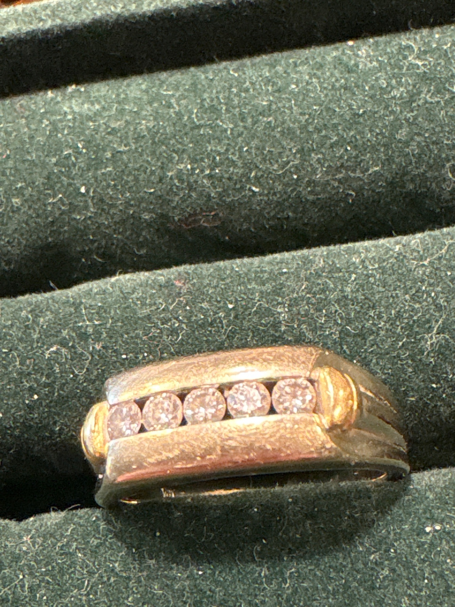 This is a contemporary men's band featuring five round brilliant-cut diamonds, estimated to be approximately 0.05 to 0.10 carats each, set in a horizontal channel-set configuration. The mount is constructed from a yellow tone metal, likely 10k or 14k yellow gold, featuring a brushed or satin-finish top face with high-polished beveled edges and shoulders. Each side of the channel is capped with a demi-lune or 'half-moon' raised gold accent, adding a structural architectural element to the design. The band shows signs of moderate wear, including surface abrasions, micro-scratching, and some buildup of organic debris around the diamond settings (indicative of regular use). This type of buildup can dull the brilliance of the stones but is removable with professional cleaning. The shank appears stout, suggesting a durable construction suitable for daily wear. While no hallmarks are visible in the provided image, the style and stone setting are representative of late 20th-century to early 21st-century masculine jewelry design, often used as wedding bands or anniversary rings. The craftsmanship appears to be of commercial quality with well-aligned stones and a heavy, solid-casting feel.