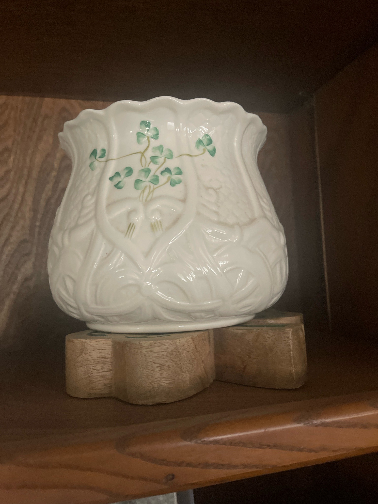 This item is a Belleek fine Parian china cachepot, featuring the iconic 'Shamrock' pattern. It is approximately 4 to 5 inches in height and width. The body is constructed from thin, translucent ivory-colored Parian porcelain with a high-luster glaze finish. The exterior features a relief-molded 'basketweave' or 'rope' texture that creates an intricate trellis-like pattern around the base. The top rim is notably scalloped and fluted, flaring outward. The central decorative element is a hand-painted cluster of green shamrocks with slender brown stems, applied over an embossed harp and floral motif. The condition appears excellent with a high glossy sheen, no visible crazing, chips, or cracks, and the colors remain vibrant. This style is consistent with 20th-century production from the Belleek Pottery company in County Fermanagh, Ireland. The craftsmanship is high-quality, characterized by the legendary 'eggshell' thinness of the porcelain and the delicate hand-painted details. It is resting on a carved wooden clover-shaped base, which may be an aftermarket display piece or a custom stand.