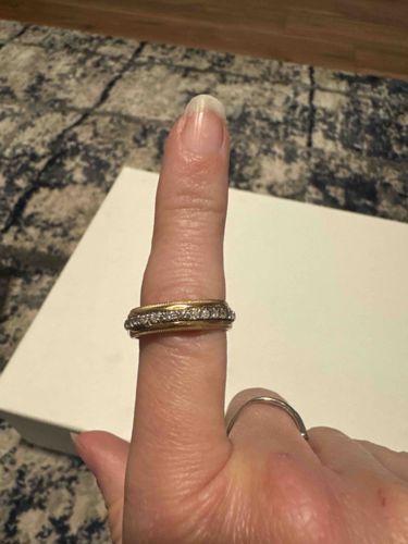 This item is a contemporary two-tone wedding or anniversary band, approximately 4mm to 5mm in width. The ring features a central channel set with approximately 10 to 12 small round brilliant-cut diamonds, estimated to be between 0.02 and 0.05 carats each. These stones are mounted in what appears to be a white gold or platinum center track, which is then flanked by two outer yellow gold bands. The yellow gold edges are finished with a delicate milgrain texture, a decorative beaded detail that suggests a vintage-inspired or Edwardian-style design influence. The metal is likely 14k or 18k gold based on common commercial jewelry standards. The overall condition shows signs of moderate wear, with visible light surface scratching and dulling of the metal polish, typical of a piece worn daily. There is no immediate evidence of stone loss or serious structural deformity in this view, though the interior hallmarks are not visible to confirm the maker or metal fineness. The craftsmanship appears to be of solid commercial quality, featuring secure channel walls and consistent stone alignment.