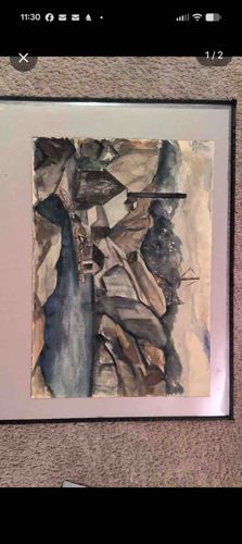 This item is an original watercolor painting on paper, executed in a modernist style with strong Cubist and Expressionist influences. The composition features a geometric interpretation of a landscape, possibly an industrial or quarry site, characterized by angular planes and a somber palette of earth tones, deep blues, and greys. Measuring approximately 12x16 inches (estimated based on framing proportion), the work utilizes layered washes to create depth and volume. The paper exhibits deckled or irregular edges, suggesting it may have been hand-cut or torn from a larger sheet. The execution displays a skilled hand, with confident brushwork and a structured use of shadow to define three-dimensional forms within a flattened perspective. Notable features include a prominent dark, horizontal rectangular form resembling a beam or pipe extending across the right-center. The artwork is housed in a simple, slim black metal gallery-style frame behind a grey-toned mat. While no signature is immediately visible in the lower margins, the style suggests a mid-20th-century origin, likely between 1940 and 1960. The condition appears fair to good; there is visible undulation (cockling) of the paper, likely due to moisture absorbed during the painting process or humidity changes over time. Some slight yellowing of the paper at the edges is consistent with age and exposure to non-acid-free materials.