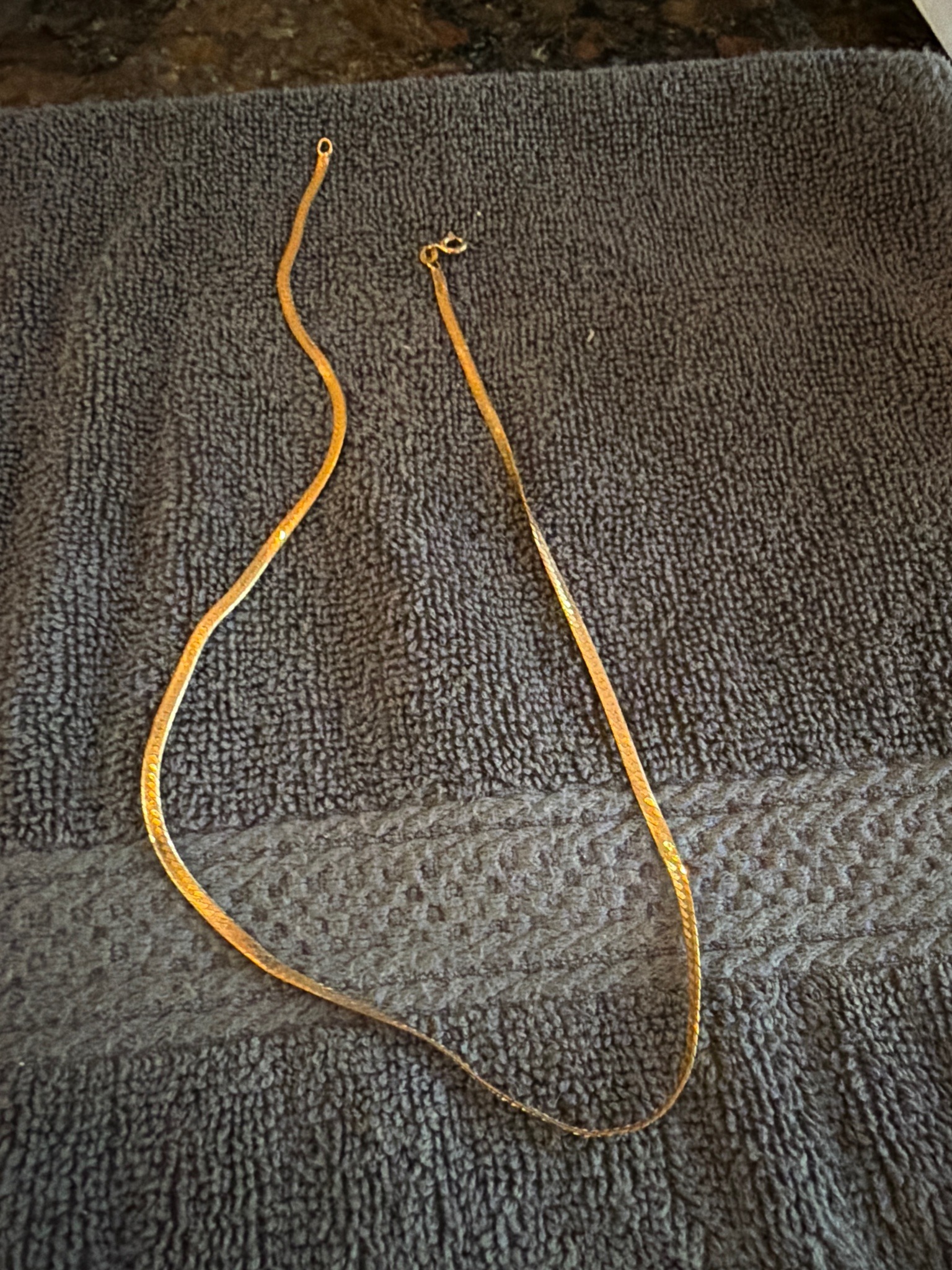 This is a yellow gold herringbone style necklace featuring a flat, flexible link construction designed to sit flush against the skin. The chain is composed of multiple tightly interlocked V-shaped links that create a smooth, liquid-like surface texture with a high-polished finish. While the exact length is not measured here, it appears to be a standard princess or matinee length (approximately 18-20 inches). The metal exhibits a warm, rich yellow hue consistent with 10k or 14k gold. The closure mechanism is a traditional spring ring clasp attached to a thin end ring. Regarding condition, the herringbone weave is notorious for its delicacy; this specimen shows several points of light kinking and unevenness in the lay of the links, particularly at the bottom curve, which is common for this vintage style. There are no obvious signs of soldering or repair, though slight surface scratches and minor oxidative patina are present. This style was highly popular during the late 20th century, specifically the 1980s and 1990s. The craftsmanship indicates a machine-made assembly typical of commercial fine jewelry, focused on achieving maximum reflective surface area through its flat-plane geometry.