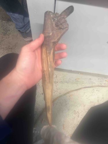 This unique object is a hand-carved wooden pointer or 'yad' (ritual/educational pointer), measuring approximately 10 to 12 inches in length. It is expertly crafted from a single piece of dense hardwood, featuring a finial shaped like a closed fist with a protruding index finger—a classic 'pointing hand' motif. The wood displays a rich, dark sepia-toned patina at the top, transitioning to a lighter, honey-colored grain along the tapered shaft. The shaft is carved with vertical decorative grooves or fluting that terminate in a sharp, refined point. The craftsmanship suggests a folk art or fraternal origin, possibly from the late 19th or early 20th century. Condition-wise, the piece shows significant age-related wear, including surface abrasions, minor chipping, and a dulling of the original finish. There are no visible maker's marks or signatures, consistent with artisanal hand-carved items of this era. The anatomical detail in the hand, including the knuckles and fingernails, indicates a high level of skill from the carver. Its utility as a reading aid or directional tool makes it a fascinating example of vernacular carving.