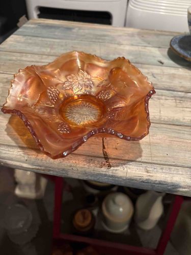 Marigold Carnival Glass Ruffled Bowl with 'Grape and Cable' Pattern