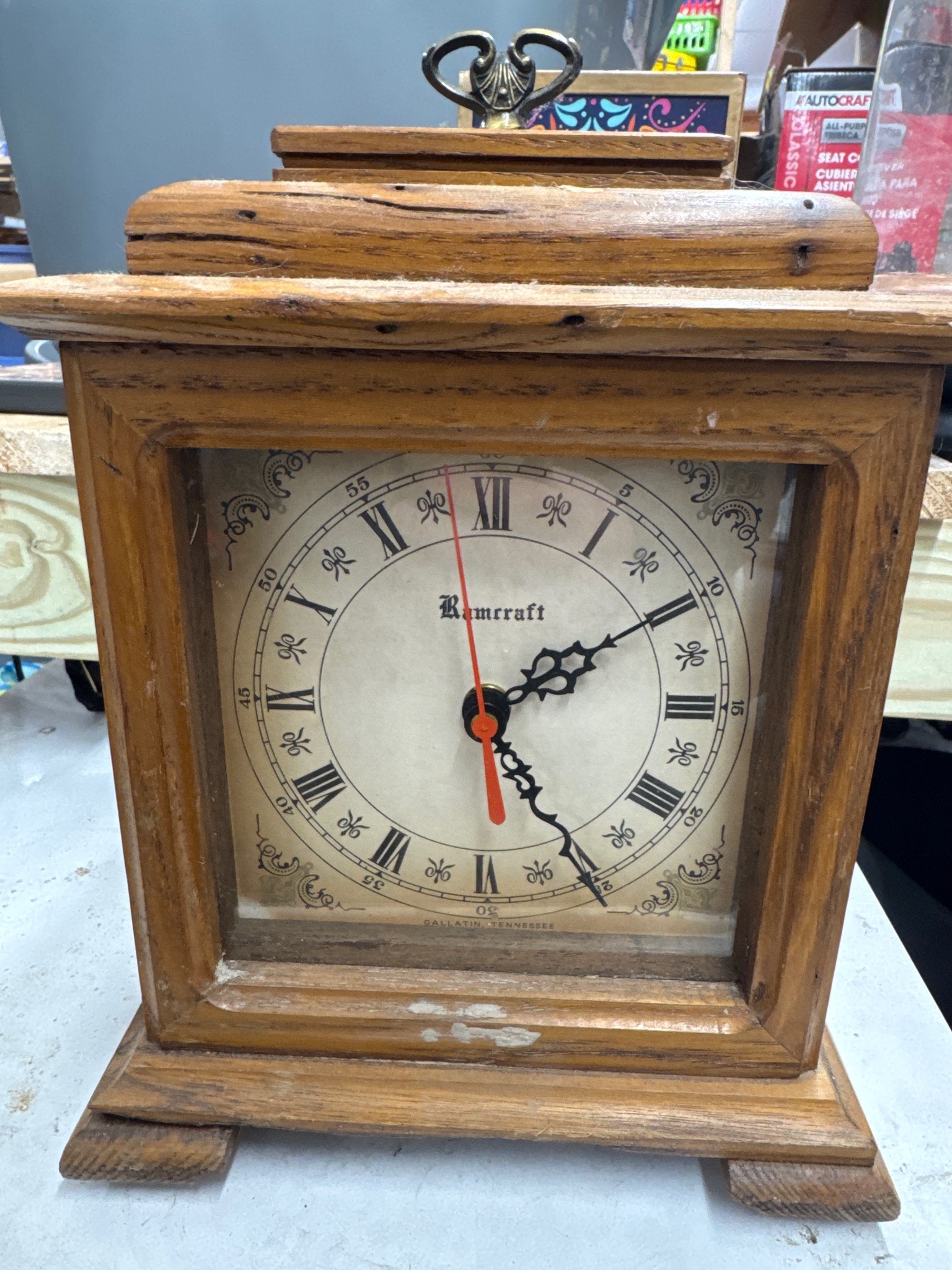 This is a vintage-style mantle clock featuring a stout, rectangular solid wood case with a medium oak finish. The case is constructed with tiered moulding at the top and base, sitting upon two slab-like wooden feet. It is topped with a decorative brass heart-shaped finial or handle with fan detailing. The clock face is square, protected by a glass pane, and features an antiqued cream or parchment-colored dial. The dial is marked with black Roman numerals for the hours and smaller Arabic numerals at five-minute intervals. Decorative black filigree is printed in the corners of the face. The clock is branded with 'Ramcraft' in a gothic font and 'Gallatin, Tennessee' along the bottom edge. It features ornate black hour and minute hands and a contrasting red sweep second hand. The wooden casing shows significant signs of wear and age, including numerous scuffs, paint splatters on the lower molding, and deep grain weathering, particularly on the top tier. The craftsmanship reflects a rustic or country aesthetic, likely dating from the late 20th century. The overall condition appears used with a heavy patina that suggests it was stored in a work environment.