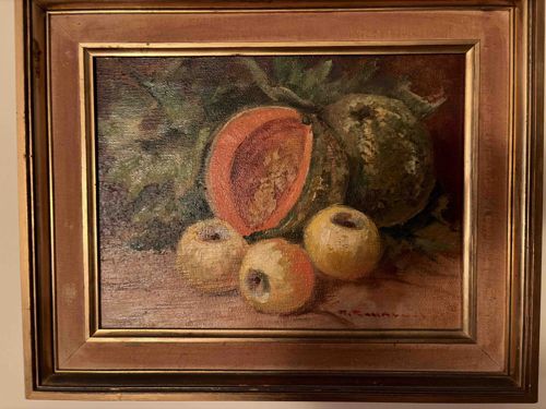This is an original oil painting on canvas or board, depicting a classic harvest still life. The composition features two large winter squashes or gourds - one sliced open to reveal a vibrant orange interior with visible seeds - and three yellow apples in the foreground. The painting utilizes a warm, earthy color palette dominated by greens, oranges, and yellows against a dark, moody background with hints of foliage. The brushwork is impressionistic and textural, characterized by thick impasto application that adds physical dimension to the skin of the fruit and the surrounding leaves. The piece is housed in a multi-tiered vintage wooden frame with a gilded gold finish and a wide, recessed linen liner. Notable markings include a red signature in the lower right corner, which appears to read 'R. S...'. The painting shows signs of age with a gentle overall patina. The frame exhibits minor surface wear, small scuffs on the wood, and some light staining on the inner fabric liner, consistent with a mid-20th-century origin. The craftsmanship reflects a skilled hand, particularly in the handling of light and specular highlights on the fruit surfaces.