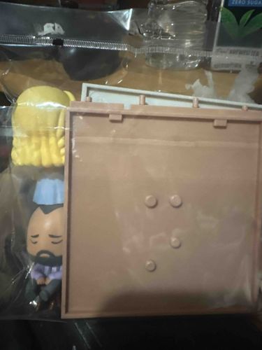 This item is a collectible novelty vinyl figure set depicting the characters Jim Halpert and Pam Beesly from the American television series 'The Office'. The figures are rendered in the distinct 'Youtooz' stylistic design, characterized by oversized heads and 'X' or curved eyes. Jim is shown with his signature beard and a somber expression, wearing a purple button-down shirt and grey trousers. Pam is partially visible with blonde, textured hair and a blue blouse. The set includes a tan-colored plastic base with raised pegs for mounting the figures, and a secondary white backdrop piece. The items are currently contained within their original clear plastic protective polybag, suggesting they are in 'new' or 'unplayed with' condition with no visible scuffs or paint transfer. These figures are typically made of high-quality PVC and are part of a limited edition run, popular among modern pop-culture collectors and fans of the series. The construction involves injection-molded plastic with painted detailing that appears crisp and uniform.