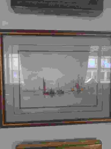 This item is an original framed painting depicting a maritime landscape, featuring various sailing vessels on a calm body of water. The artwork appears to be a watercolor or fine ink wash on paper, characterized by a soft, atmospheric palette of greys, muted blues, and distinct pops of red on the boat sails. The composition utilizes a wide horizon line, emphasizing the vastness of the sky and sea, typical of 19th or early 20th-century marine art. The work is professionally mounted with a multi-layered matting system that includes a 'French mat' style with fine hand-drawn ink lines, adding depth and a traditional aesthetic. The piece is housed in a wooden frame with a gold-tone inner fillet and a dark outer finish. In terms of condition, the paper shows slight age-toning, consistent with a vintage or antique origin. There are noticeable reflections on the protective glass, indicating it may not be non-reflective museum-grade glass. The framing appears secure, though the frame itself shows minor scuffs along the edges. The overall craftsmanship suggests an artist skilled in capturing light and nautical detail, potentially hailing from a European school of maritime painting. No artist signature is clearly visible in the lower margins from this perspective, though one may be present under the matting.