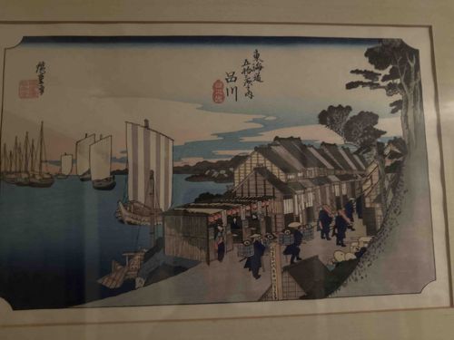 This is a horizontal woodblock print (u-kiyoe) on washi paper, housed within a frame using an arched-corner mat. This iconic scene depicts Shinagawa, the first station on the Tokaido road from Edo. The composition features several Daimyo retainers walking past teahouses along the bay, with several sailing vessels (utase-bune) anchored in the harbor under a soft dawn sky. The color palette includes deep indigo 'bokashi' (gradation) in the water, subtle pinks and yellows in the morning sky, and earthy browns for the architecture. Notable markings include the series title and station name in the upper-center cartouche, Hiroshige's signature (Hiroshige ga) at the top left, and the red Hoeido publisher's seal. Regarding condition, the print shows signs of moderate age-toning and light-induced fading, common for Edo-period or early Meiji-era woodblocks. There is visible slight darkening of the paper edge near the matting, though the registration of the woodblocks remains sharp, indicating a relatively early or high-quality printing. The craftsmanship is characterized by the intricate line work of the pine trees on the far right and the detailed garments of the travelers. This piece represents the ukiyo-e style of the 1830s, specifically the Hoeido edition which established Hiroshige's fame as a landscape artist.