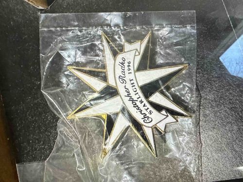This item is a collectible holiday ornament or pin produced by renowned designer Christopher Radko for the year 1996. The piece is shaped as a multi-pointed star, specifically featuring a double-layer celestial design. It is constructed from a gold-toned metal base with high-quality enamel or resin inlay in white and possibly black or deep blue. A prominent white banner scrolls across the center, bearing the inscription 'Christopher Radko' in a stylized script, followed by 'STARLIGHT 1996' in a block serif font. The edges are finished with a fine gold-toned metallic trim, indicating high craftsmanship standards typical of the Radko brand during the mid-1990s. The item is currently housed in its original clear plastic zip-lock bag, which has protected the surface from oxidation and scratches. The enamel appears smooth and vibrant without visible cracks or yellowing, and the metallic borders show no signs of tarnishing or plating loss. This specific piece was likely a limited edition release or a specialty gift-with-purchase associated with the 'Starlight' collection, a period noted for its opulent and nostalgic Christmas designs. Its condition is excellent/mint, appearing to be 'New Old Stock' (NOS).