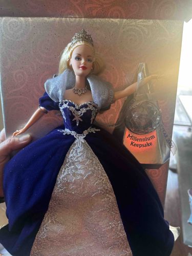 This collectible doll represents the 2000 'Millennium Princess' Barbie, produced by Mattel to commemorate the turn of the millennium. The doll features a classic articulated plastic body with a fair complexion, long platinum blonde hair styled with a silver-tone tiara, and bold red lipstick. She is dressed in a formal blue velvet gown featuring a wide A-line skirt with a contrasting silver lace front panel and shimmering silver trim along the sweetheart neckline. A sheer, stand-up silver collar adds a regal touch to the ensemble. She carries a clear, faceted 'Millennium Keepsake' crystal-style ornament in her left hand, which is held by a silver ribbon. Accessories include a matching necklace and ring. The item is shown within its original display box, which features a silver and salmon-pink swirled background and a 'Happy New Year 2000' sash. The doll appears to be in excellent, 'Never Removed From Box' (NRFB) condition, showing no visible signs of play wear, dust accumulation, or fabric degradation. The packaging shows minor signs of handling but remains structurally sound. This special edition was widely produced, making its value dependent on the pristine state of both the doll and the original packaging.