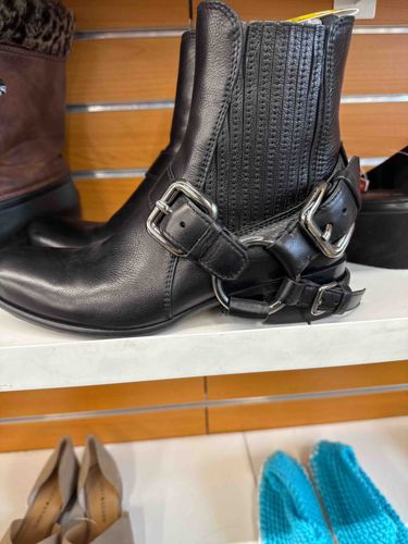 A pair of high-end designer ankle boots crafted from smooth, premium black calfskin leather. These boots feature a distinctive biker-inspired aesthetic characterized by a multi-strap harness detail wrapped around the ankle and heel, secured with oversized polished silver-tone roller buckles and a central metal ring. The design incorporates a rounded toe and dual elasticated side gussets (Chelsea style) with vertical ribbed stitching for flexibility and texture. A signature element of this specific model is the architectural 'cut-out' or recessed heel design, which is reinforced with a metal plate. The craftsmanship is evident in the precise tonal stitching and the substantial weight of the hardware. Condition appears to be excellent with minimal creasing across the vamp, suggesting little to no wear. There are no visible scuffs on the leather or tarnishing on the metal components. These boots represent a contemporary luxury style from the mid-2010s to present, blending utility with high-fashion hardware detailing.