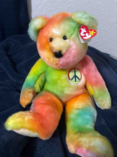 This item is a Ty Beanie Buddy named 'Peace,' the larger counterpart to the original Beanie Baby version. This plush bear features a vibrant, multi-colored tie-dye patterned fabric made of high-quality Tylon, which is a soft, long-pile synthetic fiber characteristic of the Beanie Buddy line. Due to the tie-dye process, the color distribution of orange, green, yellow, and fuchsia is unique to this specific bear. A distinctive peace symbol is embroidered on the left side of the bear's chest in multi-colored thread. It has hard plastic black eyes and a black plastic nose. The bear dates to approximately 1999, following the 1996 release of the Beanie Baby version. One of the most critical value factors is the presence of the iconic red 'heart' hang tag, which appears to be in excellent condition with no visible creases or tears. The plush itself shows no signs of matting, stains, or damage, consistent with the user's description of '100% perfect condition.' The size is approximately 14 inches tall, making it significantly larger than the standard Beanie Baby. The construction is robust with clean stitching and soft polyester fiber filling. It bears the official Ty trademark, signifying its authenticity within the late 90s collectible plush market.