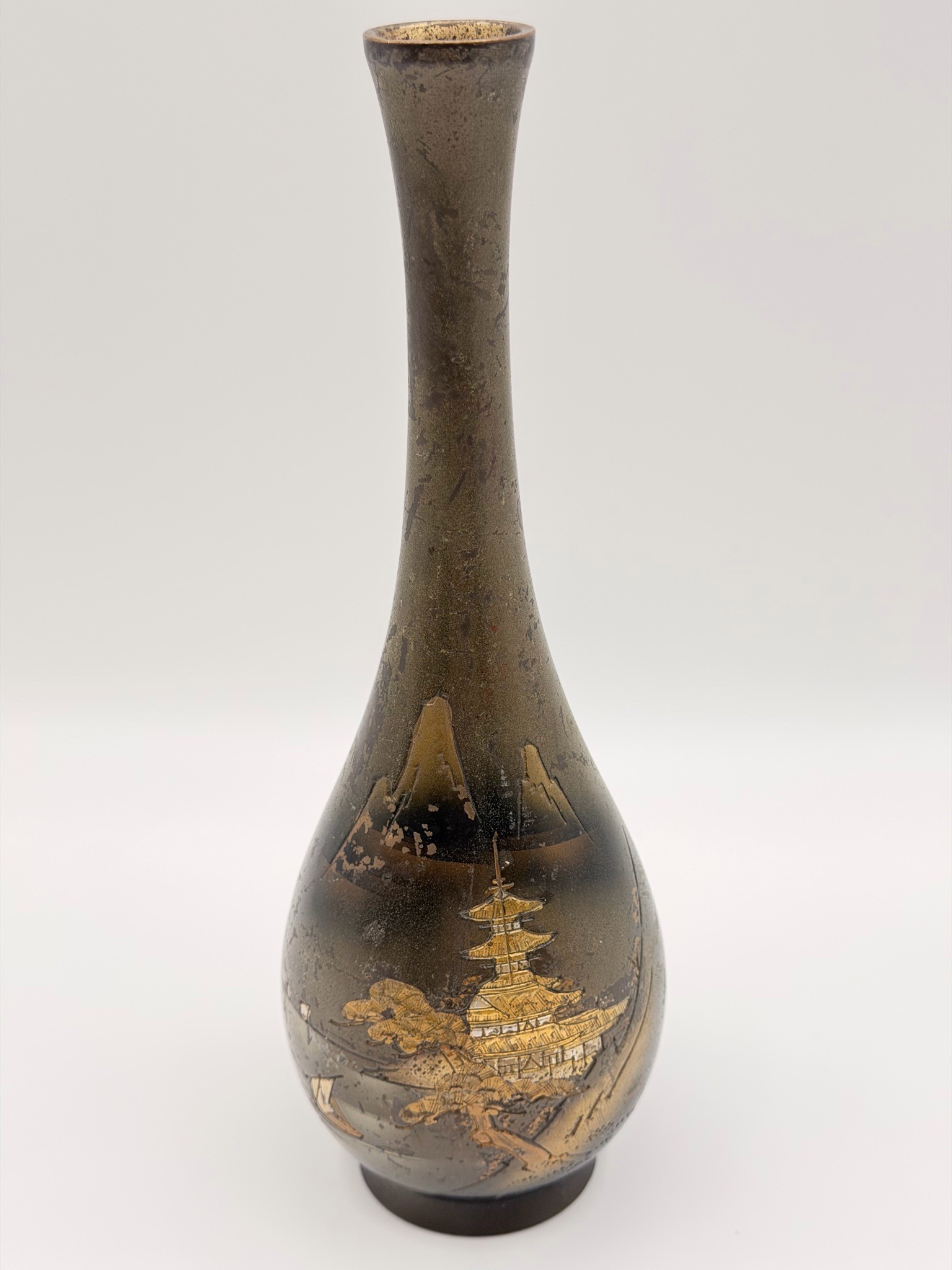 This is a fine Japanese mixed-metal bud vase, likely dating from the Meiji period (late 19th to early 20th century). The vase features a slender, elongated neck that flares slightly at the rim, transitioning into a bulbous, teardrop-shaped body. It is constructed from a dark patinated metal, possibly bronze or Shibuichi (a silver-copper alloy). The central decoration utilizes the 'Zogan' (inlay) technique, depicting a serene landscape with a multi-tiered pagoda, Mount Fuji in the background, and coastal elements. The inlay involves gold and silver tones, creating a rich contrast against the dark, mottled patina of the base metal. The craftsmanship displays high-level detail in the architectural lines of the pagoda and the textured peaks of the mountain. Regarding condition, the vase shows a heavy, aged patina throughout the surface with some visible pitting, spotting, and minor oxidation consistent with significant age. There is some wear to the gilt highlights, particularly on the mountain peaks and lower foreground. The interior of the neck shows a lighter, yellowish metallic tone, suggesting a core and exterior layer. No specific maker's mark is visible in this view, but the style is characteristic of the Kyoto school of metalwork.