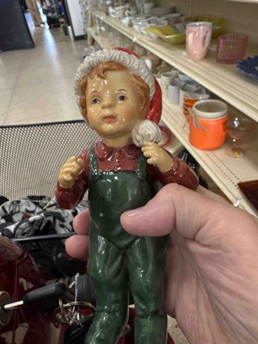Vintage Goebel Hummel-Style Ceramic Christmas Figurine: Young Boy in Overalls with Santa Hat