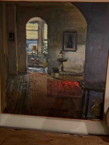 This is a large-scale oil painting on canvas depicting a thoughtful, layered interior scene. The composition utilizes a 'view through' technique, looking from a dark, shadowed room into a brightly lit space beyond an archway. The palette is dominated by moody purples, deep browns, and olive tones in the foreground, contrasted sharply by the pale yellows and blues of the sunlit room in the background. Physical details include a red patterned rug in the center, a small pedestal table with a lamp, and framed artwork on the walls. The brushwork is expressive and painterly, with visible impasto and textured layers, suggesting a Post-Impressionist or mid-20th-century realism style. A signature is visible on the center-right of the lavender-colored wall, though it is difficult to decipher from the image, possibly reading 'Alice...' or similar. The canvas is housed in a simple, thin wooden lath frame. Condition appears stable, though there is some light surface dust and minor age-related wear to the frame edges. The craftsmanship shows a strong understanding of perspective and tonal values, creating a quiet, atmospheric domesticity. The piece likely dates from the mid-to-late 20th century.