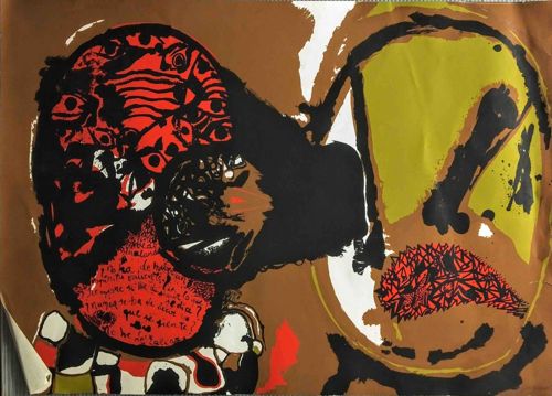 This is a large-format abstract expressionist composition executed on a heavy paper substrate, measuring approximately 2983 x 2140 pixels in digital scale. The artwork features a complex interplay of organic, biomorphic shapes and dense clusters of symbolic elements. The primary color palette consists of earthy ochre, vibrant red, stark black, and white. On the left side, a bulbous, head-like form is filled with intricate black line work suggesting eyes and text in Spanish, adding a psychological and narrative depth. The center is dominated by deep black gestural masses that bridge toward the right, where a large, yellow-gold circular field contains further abstract markings and a red, spiked, geometric shape resembling a mouth or organic growth. The craftsmanship indicates a sophisticated use of layering, common in mid-20th-century avant-garde styles like CoBrA or Informalism. Condition-wise, the paper shows visible structural issues, including significant creasing, rolling at the edges (specifically the bottom left corner), and undulations across the surface, suggesting long-term storage without a frame. Despite these physical wear patterns, the pigment remains saturated. The piece lacks a visible signature in the provided view but represents a high-quality example of expressive, non-representational art likely dating from the 1960s to 1970s.