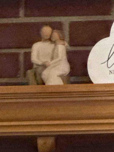 This item is a hand-painted resin figurine titled "Together" from the Willow Tree collection, originally sculpted by artist Susan Lordi. The piece measures approximately 6 inches in height and depicts a man and woman sitting close together in a tender embrace. Characteristic of the Willow Tree style, the figures feature faceless expressions, intended to convey emotion through gestures and body language alone. The figurine is cast from a hand-carved original, showcasing a wood-carved texture across the surfaces. The man is depicted in a seated position wearing a cream-colored shirt and darker, brownish-grey trousers, while the woman sits beside him leaning into his shoulder, wearing a cream-colored dress. The color palette is composed of soft, muted earth tones and creamy whites. The construction is solid resin with a matte finish. While specific factory markings are hidden on the base, this line is produced by DEMDACO. The condition appears to be excellent with no visible chips, cracks, or fading, maintaining the original subtle patina and soft textural detail found in contemporary collectibles from the late 20th to early 21st century.