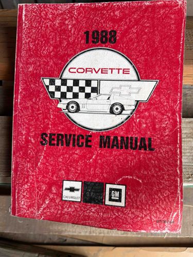 This is an original factory-issued shop service manual for the 1988 Chevrolet Corvette (C4 generation). The manual features a distinctive heavily textured red cover with a semi-gloss finish, designed for durability in a workshop environment. The front cover displays bold black typography for the year '1988' and the title 'SERVICE MANUAL'. A central circular graphic contains the 'CORVETTE' name in red, a checkered flag, the Chevrolet bowtie logo, and a profile illustration of a C4 Corvette coupe. Logos for Chevrolet and GM are visible at the bottom. Regarding condition, the manual shows significant signs of age and utility appropriate for its approximate 35-year age. There is prominent edge wear along the top, bottom, and spine, with white paper substrate showing through the red pigment. Visible creasing and surface scuffs are present across the cover, along with localized darkening from handling or grease, particularly near the edges. The construction is a thick softcover binding, likely containing several hundred pages of technical diagrams, repair procedures, and specifications intended for professional mechanics. This item represents an essential piece of automotive literature for collectors and restorers of late-80s performance vehicles.