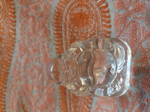This is a small, solid figurine of the Laughing Buddha (Budai), hand-carved from a single piece of high-clarity clear quartz. The piece measures approximately 2 to 3 inches in height. It depicts the seated, rotund deity with a characteristic joyful expression, elongated earlobes, and a large protruding belly. The craftsmanship shows smooth, rounded contours with deep recesses defining the folds of the robes and the facial features. The material is remarkably transparent with minimal visible inclusions, refracting light through the polished surfaces and deep-relief carving. Given the 'heavy solid' description, it likely contains significant mineral weight consistent with natural crystalline quartz. The condition appears excellent with no major chips, cracks, or fractures visible; the surface maintains a high-gloss luster indicative of skilled lapidary work. While there are no visible maker's marks, the style is contemporary, likely mid-to-late 20th century, following traditional Chinese iconographic designs. The quality of the stone and the precision of the polish suggest it was intended as a decorative feng shui object or a high-end spiritual collectible.