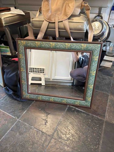 This rectangular wall mirror features a composite frame design with a multi-layered aesthetic. The outer and inner borders are constructed from a dark mahogany-toned wood or wood-substitute with a smooth, rounded profile. The primary decorative element is a wide, flat inset panel between the wooden borders, which is upholstered or covered in an Arts and Crafts style pattern. The pattern showcases stylized floral and leaf motifs in shades of olive green, muted yellow, and small white dotted flowers, reminiscent of William Morris designs. The overall dimensions appear to be medium-sized, suitable for a hallway or bathroom vanity. The mirror glass itself is flat and clear, showing a sharp reflection. Structurally, the frame appears solid with tight mitered corners. While there are no visible maker's marks on the front, the quality of the pattern application suggests late 20th-century craftsmanship or a contemporary high-quality reproduction of a vintage style. The item is noted to be in excellent condition, with no visible chipping to the glass, fading to the fabric inset, or significant gouging in the wooden frame portions. The matte finish on the wood complements the soft texture of the inset, providing a refined, traditional or cottagecore aesthetic.