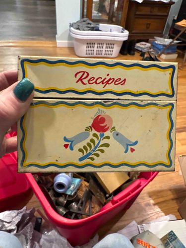 This is a vintage lithographed tin recipe box, likely manufactured by the Ohio Art Company around the 1950s to 1960s. The box features a cream-colored background adorned with a colorful Pennsylvania Dutch-style floral motif on the front, consisting of a central red and pink rose flanked by two blue bellflowers and green leaf accents. The word 'Recipes' is printed in a red cursive font across the top lid. The decorative border features blue and yellow scalloped undulating lines that frame the main designs on both the base and the lid. It is constructed from thin sheet metal with a hinged lid. Regarding condition, the box shows moderate signs of age and wear appropriate for kitchen use, including visible surface scratches, small areas of paint loss particularly along the edges and hinges, and scattered dark oxidation spots (patina) consistent with older tinware. The colors remain relatively vibrant but show a slight yellowing of the cream base coat. This item represents a classic piece of mid-century Americana kitchenware, valued for its nostalgic graphic design and functional durability. Similar pieces were staples in post-war American households for organizing handwritten recipe cards.