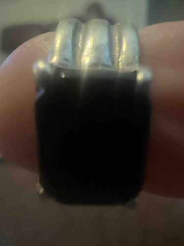 This item is a statement ring featuring a large, rectangular emerald-cut gemstone, likely black onyx, obsidian, or black tourmaline, set in a silver-toned metal mount. The gemstone is held securely by four rounded prongs at each corner. The shoulders of the ring exhibit a distinctive 'triple-ribbed' or gadrooned architectural design, which adds a substantial, masculine, or bold aesthetic to the piece. The metal appears to be sterling silver based on the soft luster and visible greyish patina, though no hallmarks are visible in the current view. Physically, the ring shows signs of moderate wear, characterized by numerous fine surface scratches on the metal and a slightly dulled finish, suggesting regular use. The gemstone surface appears relatively intact, though the high-contrast lighting makes it difficult to detect minor facet-edge abrasions common in softer stones like onyx. The craftsmanship indicates a commercial or mid-century modern influence, possibly dating from the late 20th century. The heavy setting and dark monochromatic color palette suggest a piece designed for durability and a sophisticated, minimalist style.