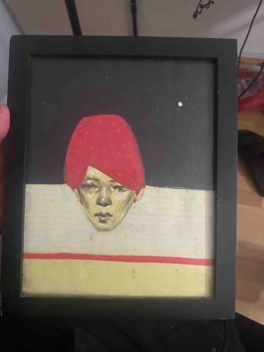 This is an original mixed media or acrylic painting on what appears to be paper or board, housed within a contemporary black wooden or composite frame. The artwork features a stylized, melancholic portrait of a figure with an oversized, textured red head covering, possibly a strawberry-inspired hood or a unique cap. The composition is divided into a stark tripartite background: a dark charcoal/black upper field containing a single white circular celestial body, a central white/cream horizontal band where the face resides, and a lower pale yellow section bordered by a thin red horizontal line. The face is rendered with expressive, illustrative linework and muted olive and yellow skin tones, featuring heavy-lidded eyes and white accents on the cheekbones. According to the owner, the piece is signed on the verso by Evan Mendel, a contemporary artist known for figurative work that blends street art aesthetics with fine art portraiture. The condition appears fair to good; there is some visible surface dirt or light staining on the white and yellow background sections, and the bottom right corner of the frame shows a small scuff or nick. No glass is visible in this image, suggesting the work may be exposed. The style is characteristic of early 21st-century contemporary illustrative art.