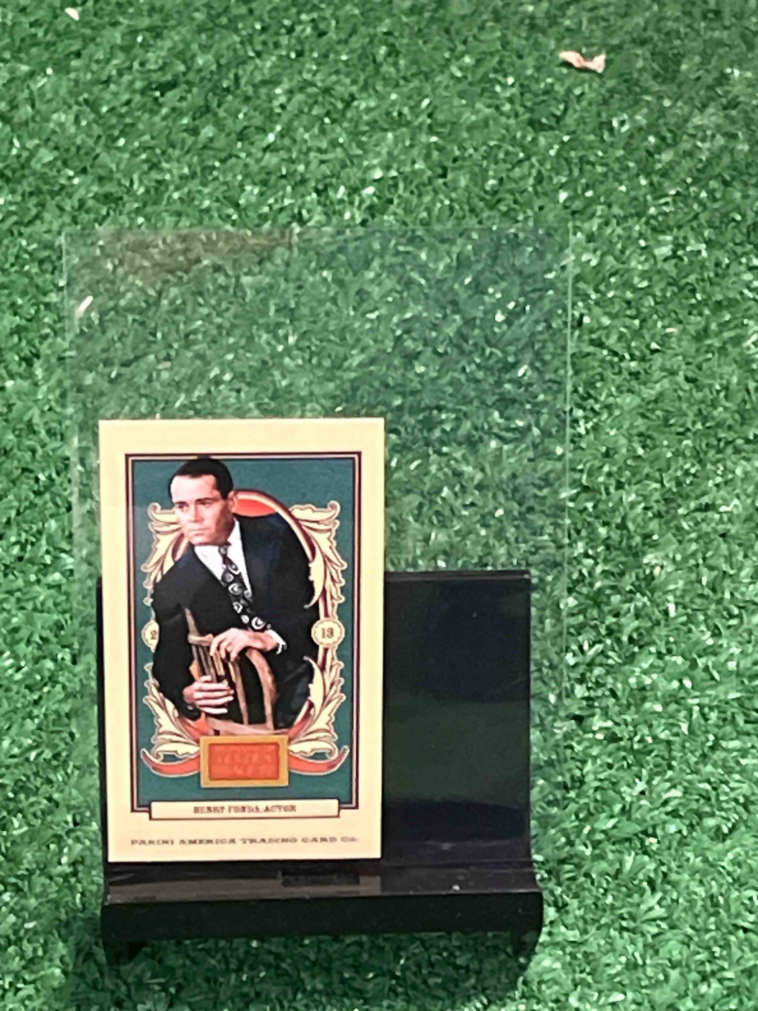 This is a modern collectible trading card produced by Panini America, featuring the legendary American actor Henry Fonda. The card is designed with a distinctive retro or 'Golden Age' aesthetic, mimicking the style of early 20th-century tobacco cards. It is housed in a clear protective plastic sleeve and displayed on a black tiered stand against an artificial turf background. The card's artwork depicts a colorized portrait of Fonda in a formal suit and patterned tie, framed by an ornate, gold-toned rococo-style border. The background within the frame is a deep teal, which contrasts with the cream-colored outer border. At the bottom, a small red nameplate reads 'Henry Fonda' above the text 'Henry Fonda, Actor' and 'Panini America Trading Card Co.' printed in black. The card possesses sharp corners and clean edges with no visible creasing or surface wear, indicating an Excellent to Near Mint condition. The printing is high quality with rich color saturation and precise registration. This specific series from Panini is known for celebrating historical icons beyond sports, appealing to both cinema enthusiasts and traditional card collectors.