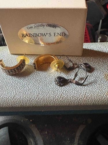 This set consists of two distinct pairs of earrings displayed with a vintage retail box. The first set is a pair of chunky, gold-tone 'C' shaped hoop earrings featuring a pave-style setting of clear rhinestones or crystals. These hoops have a substantial width and utilize post backings with large plastic disc stabilizers. The gold finish appears bright, suggesting a costume jewelry quality typical of the late 20th century. The second pair comprises darkened silver-tone or pewter-tone lever-back dangle earrings. These decorative pieces feature a teardrop-shaped drop with an inset dark purple or black stone, surrounded by ornate metallic detailing reminiscent of Victorian-revival antique styles. The lever-back mechanism shows signs of oxidation and patina, particularly on the ear wires. The accompanying rectangular cardboard box features a metallic gold oval label for 'Rainbow's End Fine Jewelry Outlet,' located at 43 E. Central Ave, Pearl River, NY. The box shows minor shelf wear and discoloration consistent with age. Overall, the items represent a mix of modern glitz and traditional vintage-inspired designs, likely from the 1980s or 1990s.
