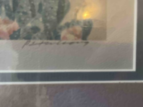 This item is a framed and triple-matted artistic print, likely a lithograph or high-quality floral decoration, featuring a desert-themed subject such as a cactus with pink blossoms. The piece is signed in the lower central-to-right margin by the artist 'P. S. Gordon' (Patrick S. Gordon), known for his vibrant, realistic watercolors of botanical and still life subjects. The color palette consists of soft greens, dusty pinks, and muted earth tones, suggesting a late 20th-century aesthetic (circa 1980s-1990s). The framing is professional, utilizing multiple mats in shades of charcoal grey and taupe to create depth and focus. The visible condition shows some glare on the protective glass, but the print itself appears well-preserved with no immediate signs of foxing or fading. The paper exhibits a textured, woven finish typical of high-quality art stocks. While the exact dimensions are not determined, the scale of the signature suggests a medium-sized decorative work. The overall craftsmanship of the matting and framing indicates a piece intended for interior design and fine art collection.