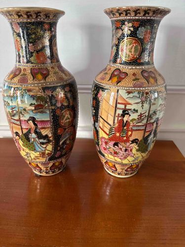 This is a matching pair of ceramic baluster-shaped vases, decorated in the Satsuma style. The vases feature a slightly flared rim, a constricted neck, and a swelling body that tapers toward a footed base. The primary decorative scheme consists of large framed cartouches depicting traditional Japanese figural scenes, including Bijin (beautiful women) in kimonos within a landscape setting featuring architecture and foliage. These central panels are surrounded by a dense decorative field of 'millefleur' floral patterns against a black overglaze ground. The color palette is rich, utilizing heavy moriage (raised enamel) in shades of gold, red, pink, and green, which adds a tactile, three-dimensional quality to the surface. Fine gold stippling and geometric borders further define the various regions of the vases. While styled after 19th-century Meiji period wares, the high-gloss finish and specific application of the enamels suggest these are likely mid-to-late 20th-century decorative exports. Condition appears generally good with no visible chips or cracks from the front, though there is typical light wear to the gold gilding on the rims and some minor surface abrasions consistent with age and handling. The craftsmanship shows a high level of detail in the repetitive floral borders and the layered enamel work.