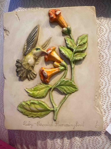 This rectangular wall plaque features a high-relief dimensional carving of a Ruby-throated Hummingbird feeding from several orange trumpet-shaped flowers. The item is crafted from what appears to be a light-colored wood or a high-quality cast composite, finished with a matte, slightly textured surface that mimics aged stone or pale timber. The central motif is hand-painted, using a palette of sage green for the leaves, vibrant burnt orange for the trumpet flowers, and a metallic bronze or olive gold for the hummingbird's plumage. The bird is depicted in mid-flight with its wings swept back, showing intricate feather detailing. The foliage includes serrated leaves with clearly defined veins. At the bottom, the title "Ruby-throated Hummingbird" is neatly inscribed in a cursive script, followed by a stylized initial or maker's mark 'f.'. The piece exhibits a distressed aesthetic, particularly on the left side where the edge appears deliberately chipped or broken to create an 'ancient artifact' or rustic look. Condition-wise, there is visible wear consistent with display, including some pigment fading and small scuffs on the flat background surface. The craftsmanship suggests a late 20th-century decorative art piece, likely part of a botanical or nature series intended for interior wall display.