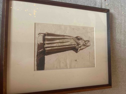 This is a framed monochrome print, likely an etching or lithograph, depicting a standing female figure dressed in voluminous, traditional European-style garments, possibly a dirndl or regional folk costume. The artwork is characterized by strong contrasts in light and shadow, suggesting a late 19th or early 20th-century aesthetic. Physically, the piece is mounted within a cream-colored mat and housed in a simple, dark wood frame with a reddish-brown stain. The paper substrate shows signs of aging, including general yellowing and a visible vertical crease or fold line through the center, which may indicate it was originally part of a book or folded for storage before being framed. There is a small, dark blemish or foxing mark in the lower-right quadrant of the image area. A signature is visible on the right side of the print, though it is not clearly legible from this distance. The overall craftsmanship suggests a professional artistic work, with attention to the drape of the fabric and the posture of the subject. The condition is fair, with the visible crease and foxing being the primary detriments to its state.