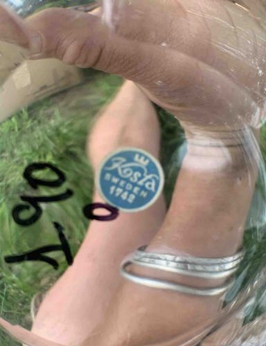 This item is a piece of high-quality Swedish art glass produced by the Kosta glassworks (now Kosta Boda). The object features a classic clear crystal composition with a thick-walled construction, indicating expert mouth-blown or hand-finished craftsmanship. A key distinguishing feature is the presence of the original blue and white circular foil label, which displays a crown emblem and the text 'Kosta SWEDEN 1742'. The year 1742 refers to the founding of the glassworks, while the specific label style suggests a production date from the mid-20th century, likely between 1950 and 1970. The glass exhibits excellent clarity and light refraction typical of lead crystal. Notably, it contains black hand-written markings on the exterior surface (reading '90' and 'o'), which appear to be temporary inventory or pricing notations rather than permanent factory glass-etched signatures. The overall condition appears excellent with no visible chips, cracks, or clouding (sickness) in the glass, though minor surface scratches may be present consistent with age. This piece exemplifies the Mid-Century Modern Scandinavian design aesthetic, focusing on purity of form and material quality.