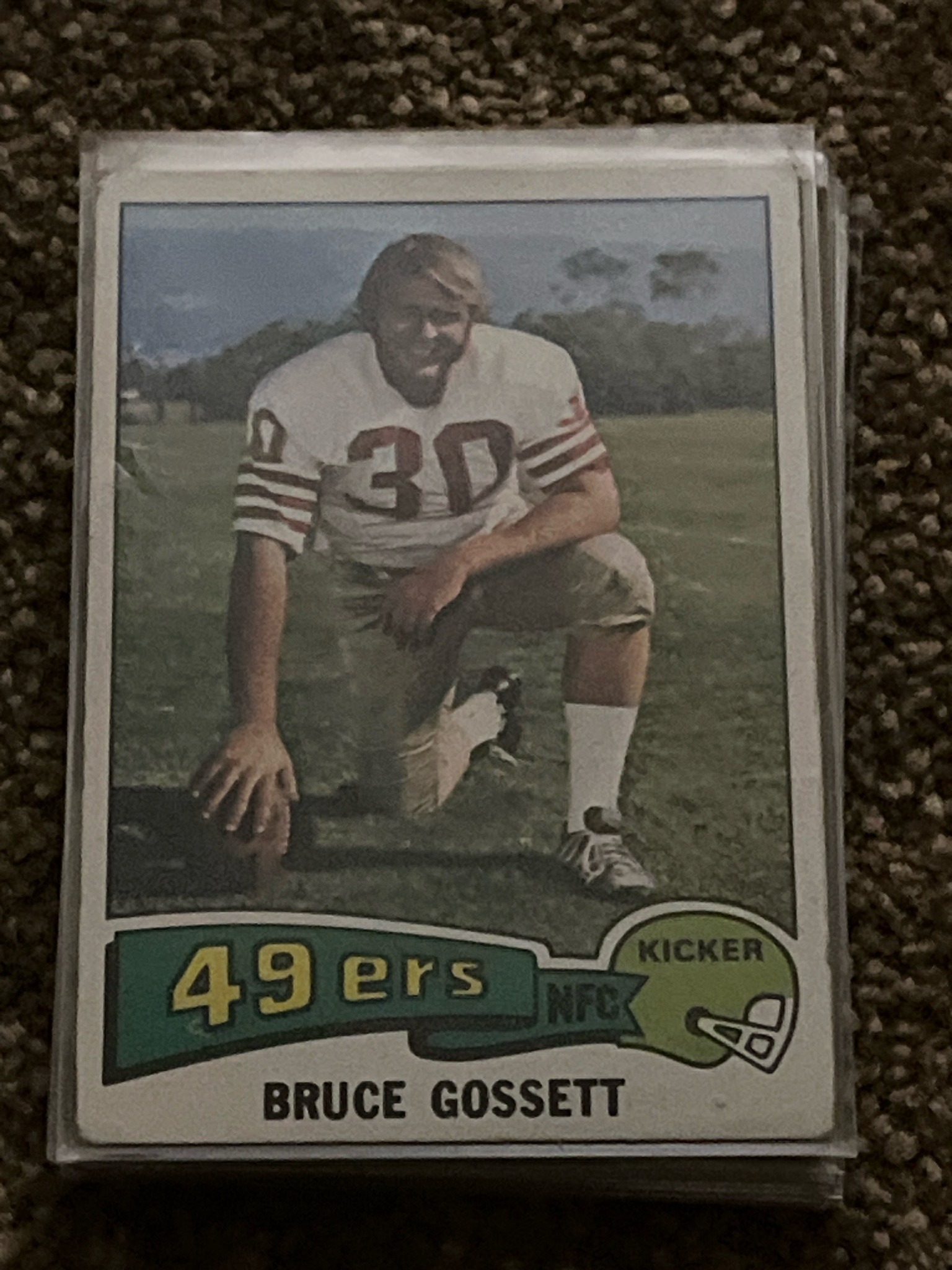 This is a vintage 1972 Topps football card featuring Bruce Gossett, the placekicker for the San Francisco 49ers. The card follows the iconic 1972 design aesthetic, characterized by a central color photograph of the player—in this instance, Gossett is depicted in a kneeling pose on a grass field, wearing his white and red numbers '30' jersey. The lower portion of the card features a distinctive green banner graphic with yellow '49ers' lettering, accompanied by a small green football helmet icon containing the position 'KICKER' and the 'NFC' conference designation. The player's name, 'BRUCE GOSSETT', is printed in bold black sans-serif capital letters along the bottom white border. Physically, the card appears to be standard vintage stock with a somewhat matte finish typical of the early 1970s. In terms of condition, the centering shows a slight bias toward the top and left borders. The corners exhibit some light softening or rounding, particularly visible at the top right and bottom right edges, which is common for an un-graded card of this age. There are no immediate visible signs of major creasing, though a faint surface indentation or 'wax stain' may be present on the left side of the image area. The card is protected within a clear plastic soft sleeve. The 1972 series is highly regarded by collectors for its vibrant design and multiple series releases, marking a classic era of NFL sports memorabilia manufacturing by Topps Chewing Gum, Inc.