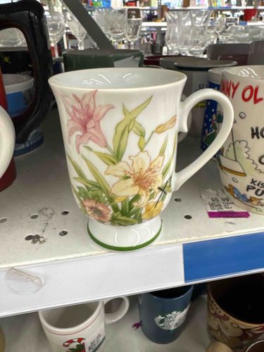 This is a footed mug crafted from fine bone china, characterized by its translucent white body and delicate construction. The mug features an elegant, slightly flared rim and a matching pedestal base accented with a thin green band. The exterior is decorated with a botanical transfer-ware design featuring large, detailed lilies in soft shades of pink and pale yellow, interspersed with leafy green foliage and smaller brownish-pink blossoms. The handle is a classic curved 'C' shape with a small spur or thumb rest at the top for ergonomics. While a specific maker's mark is not visible in the front view, the style is consistent with late 20th-century floral tableware often produced by British or Japanese manufacturers like Royal Worcester or Noritake. The condition appears to be excellent with no visible chips, cracks, or heavy crazing, though light shelf wear may be present on the underside of the foot. The glaze has a high-gloss finish, and the botanical illustration shows fine detail in the stamen and petals, indicating a decent level of mass-market craftsmanship synonymous with traditional giftware or 'tea-time' aesthetics.