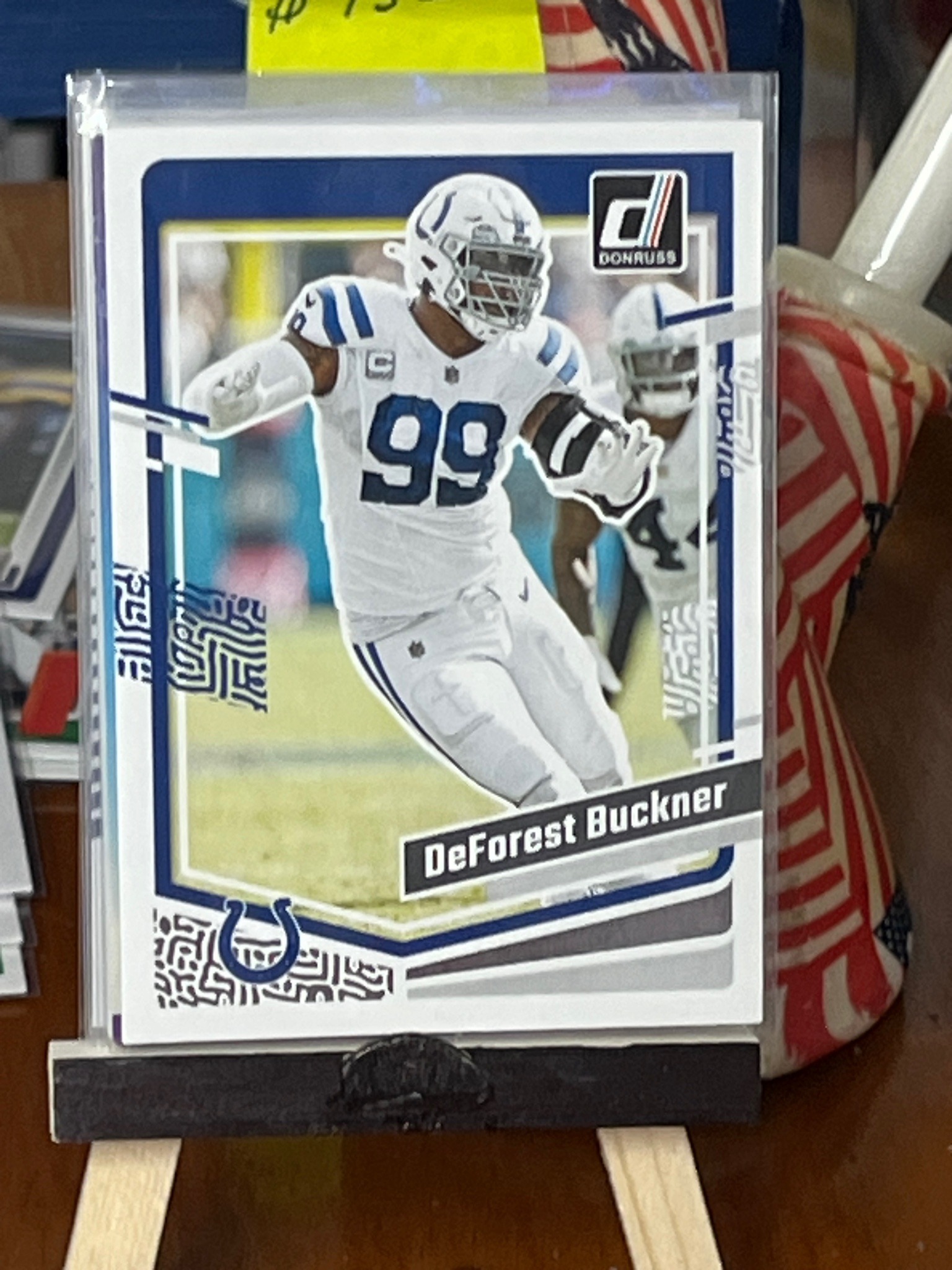 This is a standard 2.5" x 3.5" modern trading card featuring defensive tackle DeForest Buckner of the Indianapolis Colts. The card is from the 2020 Donruss Football set produced by Panini America. It features a high-gloss finish on a white cardstock base. The visual composition includes a primary action shot of Buckner in his white Colts uniform with the number 99 prominently displayed, set against a blurred stadium background. The design incorporates the classic 'Rated Rookie' era Donruss logo in the upper right. Notable aesthetic elements include a blue border design with geometric 'maze' patterns at the corners and the Colts' horseshoe logo at the bottom left. The player's name is printed in a stylized black banner at the lower right. The card appears to be in excellent to near-mint condition, housed in a protective clear plastic sleeve and a matching top-loader for preservation. The edges and corners appear sharp through the casing, with no visible surface scratches or creases. The centering of the image within the white borders looks balanced, which is a key quality indicator for modern sports card collectors.