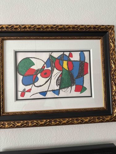 This item is an abstract color lithograph, heavily characteristic of the mid-20th-century Surrealist style popularized by Joan Miró. The artwork features bold, calligraphic black lines that intersect to create various organic and geometric shapes. These forms are filled with a primary-oriented color palette of vibrant red, lapis blue, emerald green, and a touch of mustard yellow, set against an off-white paper ground. The stippled texture within the black lines suggests a lithographic production process. Physically, the piece is housed in a sophisticated multi-layered frame consisting of a wide black recessed bezel and an outer gold-finished decorative molding with ornate shell-like flourishes. It is professionally mounted with an archival-style white mat and a secondary black reveal. The condition appears excellent with no visible foxing, fading, or moisture damage to the paper. The frame shows no significant chipping, though slight dust accumulation is noted. While no signature or edition number is clearly visible in the photograph, the composition strongly parallels Mirò's 'Lithographe' series from the 1970s. The craftsmanship of the framing indicates a high-value presentation, likely intended for a gallery or private collection setting.