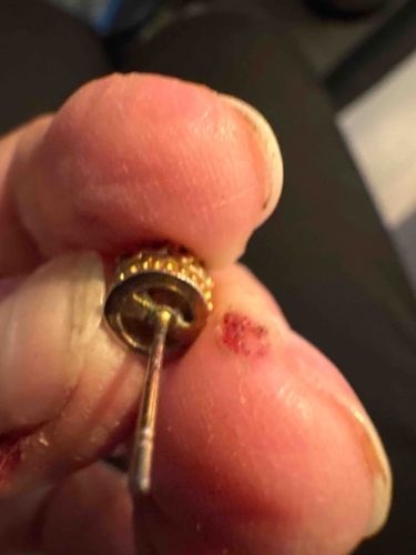 This is a single stud earring of contemporary design, likely categorized as costume jewelry. The piece features a gold-tone metal finish over a base metal, which is common in mass-produced fashion accessories. The earring consists of a circular bezel-style setting which appears to hold a central decorative element, potentially a faux gemstone or a pavé-style cluster of small clear stones, though the front face is partially obscured. The back of the setting shows a flat, circular base with a single post attached. The post exhibits two small notches near the end for a butterfly-style tension clutch. Regarding the condition, the item shows significant signs of wear and age; the gold-tone plating is rubbing away on the post and the edges of the setting, revealing a secondary greyish metal beneath. There is dark oxidation or tarnish visible at the junction where the post meets the setting. No maker's marks or metal purity hallmarks (such as '925' or '14k') are visible in this view, which supports its identification as costume jewelry. The construction quality is standard for commercial fashion jewelry, likely dating from the late 20th to early 21st century.
