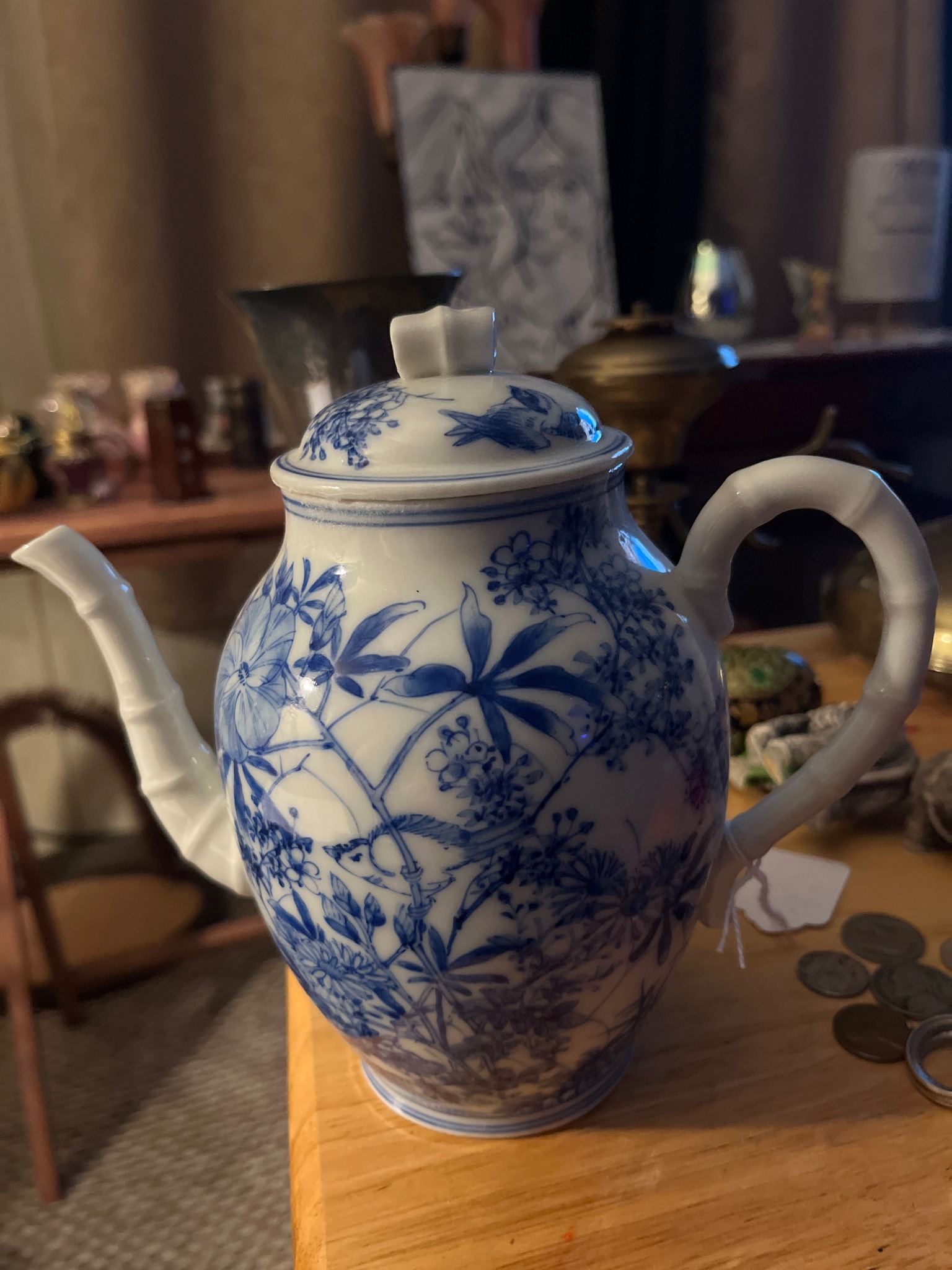 This is a fine-bodied porcelain teapot featuring a classic Chinoiserie aesthetic, likely produced in the late 19th to mid-20th century. The vessel is decorated with underglaze cobalt blue transfer or hand-finished motifs depicting a lush botanical scene with perching birds, blossoms, and intricate foliage. A distinctive feature is the slip-cast 'faux-bamboo' modeling seen on the spout and the large C-scroll handle, adding a tactile, naturalist element typical of East Asian influence in Western ceramics. The lid is domed with a matching floral motif and topped with a stylized knot or blossom finial. Physically, the porcelain exhibits a bright white ground with a high-gloss glaze. The construction shows a pear-shaped body tapering to a narrow, ringed base. Regarding condition, the glaze appears well-preserved with typical minor surface wear; there is a visible accumulation of dust or residue along the inner rim of the lid. No major cracks or restorations are immediately apparent, though internal staining from use is common in pieces of this age. The craftsmanship is of good quality, shown through the alignment of the transfer patterns and the anatomical precision of the bamboo-style molding.