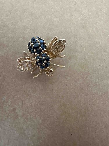 This is a finely crafted figural bumblebee brooch, likely constructed of 14k or 18k yellow gold. The body and thorax of the insect are pav-set with small, round-cut dark blue sapphires that create a deep, textured contrast against the polished gold mountings. The wings feature an intricate openwork honeycomb or filigree pattern, with the left wing notably accented by small, round-cut diamonds for added brilliance. The anatomical details are well-defined, including articulated gold legs and a detailed head. The craftsmanship suggests a mid-to-late 20th-century vintage aesthetic, common in high-end figural jewelry from the 1970s or 1980s. The piece appears to be in excellent condition with no visible missing stones or significant wear to the metal. While no hallmarks are visible from this angle, the quality of the stone setting and metalwork indicates professional manufacturing. The contrast between the deep navy sapphires and the bright yellow gold provides a classic, high-quality decorative appeal suitable for fine jewelry collections.